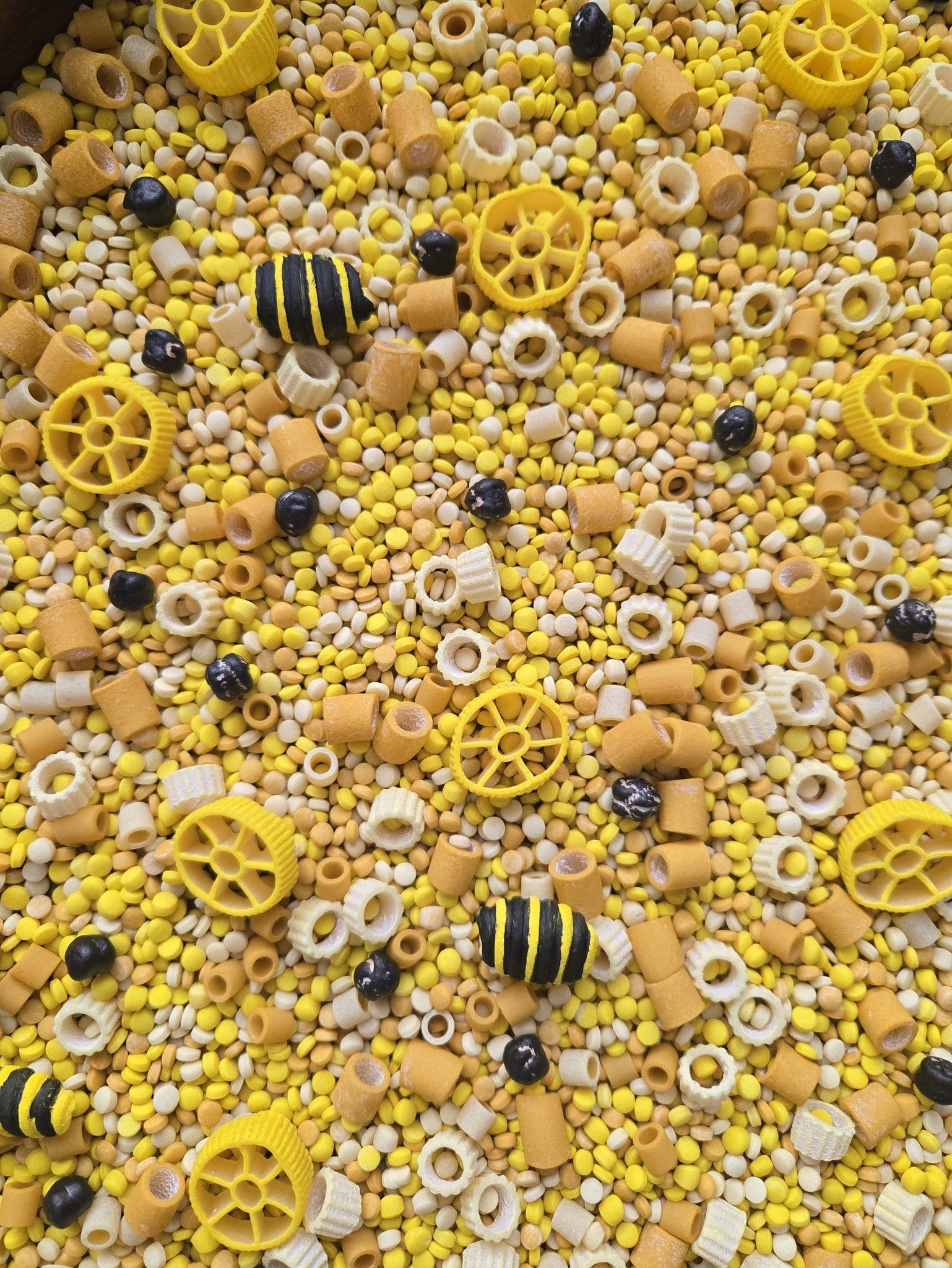 Your child will be buzzing with excitement and creativity as they engage in everything this sensory base has to offer. Created with couscous pearls, wagon wheel pasta, pasta rings, chickpeas and handpainted pasta (to look like bees) your child will absolutely love this fun and creative base that holds no limit to their imagination.